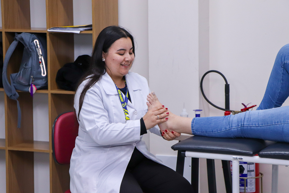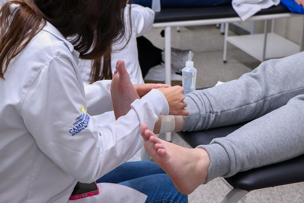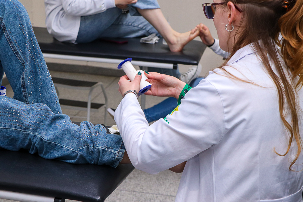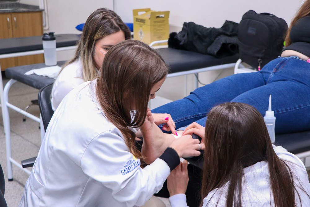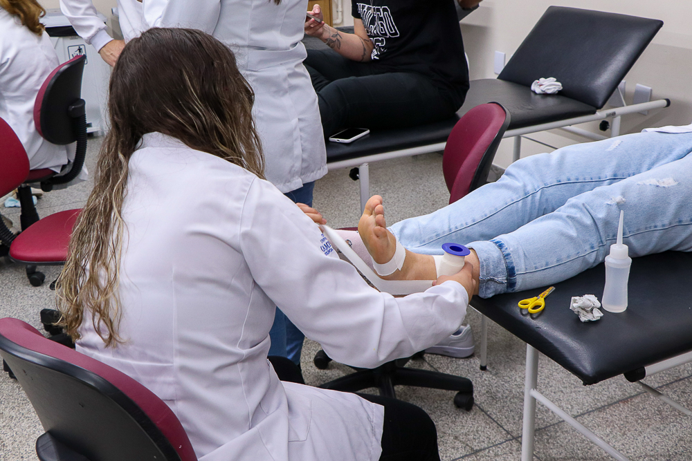 Durante a atividade, os acadêmicos aprenderam sobre as principais aplicações da bandagem, que incluem oferecer estabilidade às articulações, restringir movimentos que possam causar dor ou agravar lesões e auxiliar na recuperação de atletas e pacientes em reabilitação.