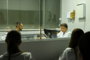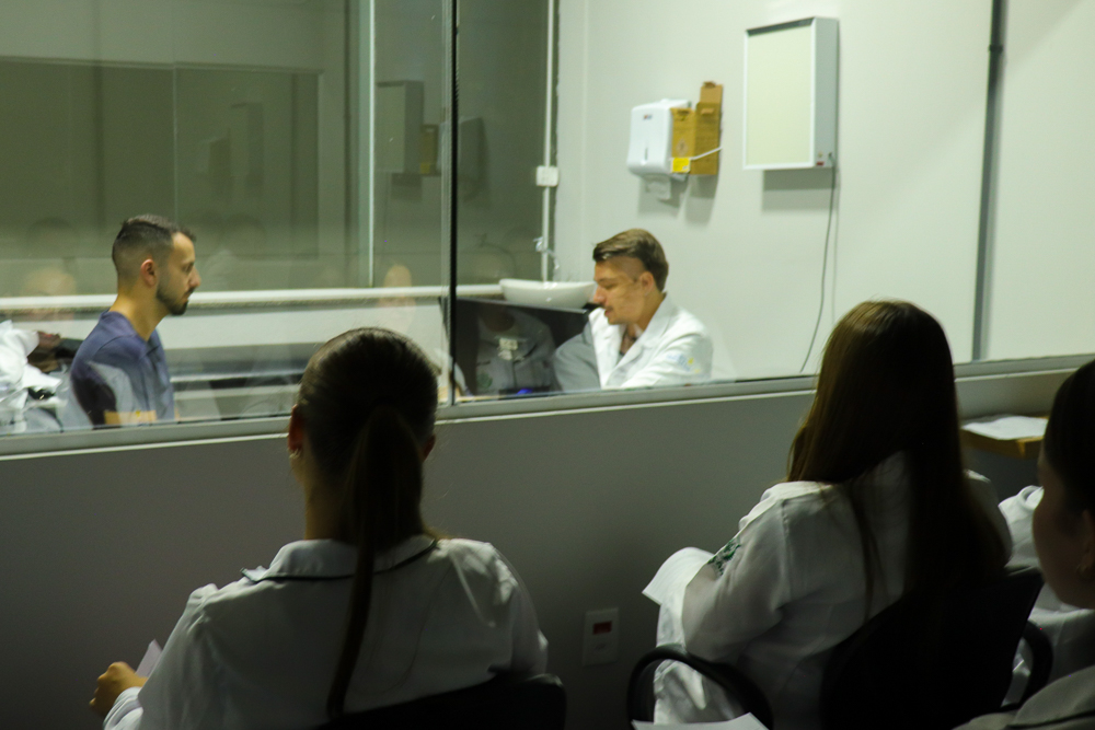 Enquanto parte da turma realizava a anamnese, os demais colegas acompanharam a atividade como observadores, fortalecendo o processo de aprendizagem por meio da análise crítica e da troca de experiências.